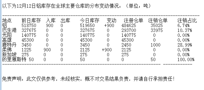 LME 12月12日铝库存分布情况