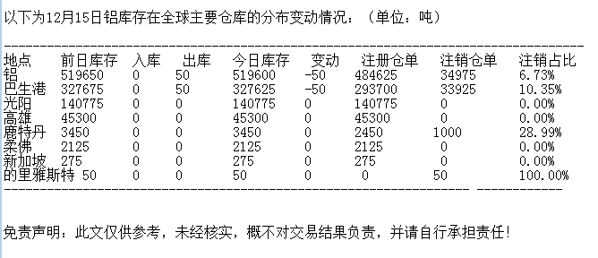 LME 12月15日铝库存分布情况