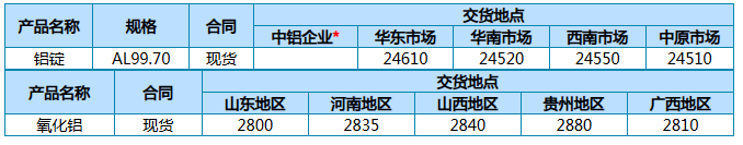 中铝股份公司主要产品3月31日现货报价