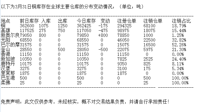 LME 3月31日铜库存分布情况