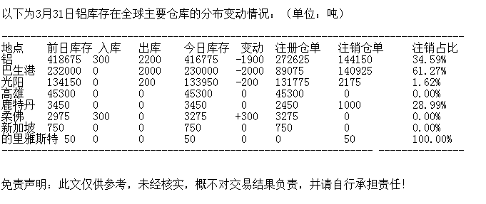 LME 3月31日铝库存分布情况