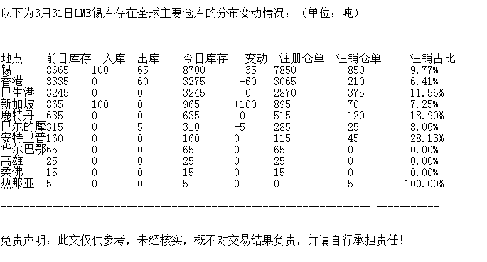 LME 3月31日锡库存分布情况