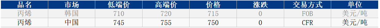 隆众资讯12月16日报道:12月15日东北亚丙烯FOB韩国均价至715美元/吨稳定,CFR中国均价至750美元/吨稳定。