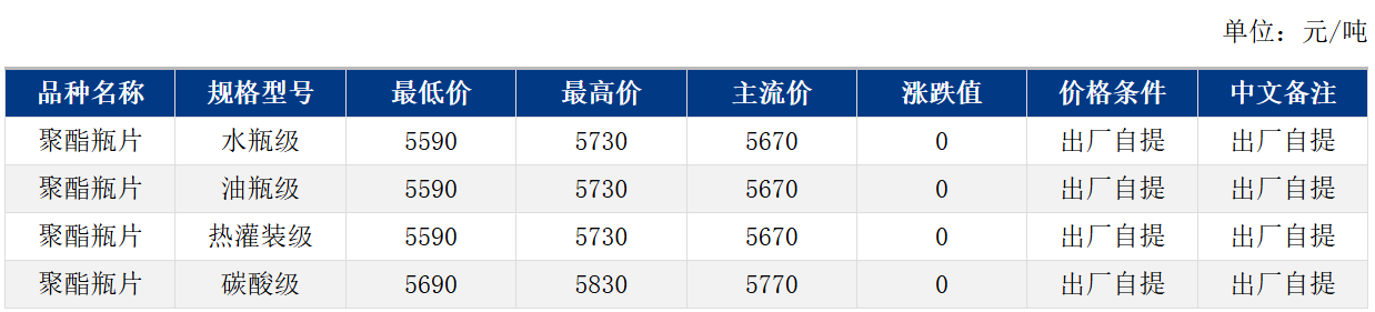 华东市场聚酯瓶片收于5670,涨跌值0,原油拖累原料下行,聚酯瓶片工厂部分报稳,市场重心暂时僵持整理,12月货源报盘5590-5730,局部略高5800或期货合约2602升水20-40,递盘5570-5650。(单位:元/吨)