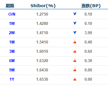 12月17日 ,上海银行间同业拆放利率(Shibor)涨跌互现。 隔夜shibor报1.2750%,上涨0.10个基点 ; 7天shibor报1.4280%,下跌0.10个基点; 1个月shibor报1.5410%,上涨0.40个基点; 3个月shibor报1.6010%,上涨0.60个基点;