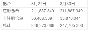 NYMEX 3月30日钯金库存统计