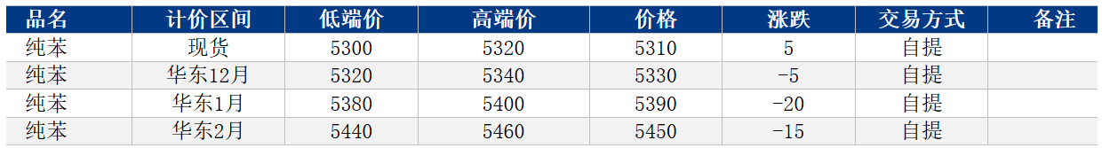 早间,华东纯苯市场现货价格小幅上涨,远月价格下跌。现货买盘5300,卖盘5320;12下买盘5320,卖盘5340;1下买盘5380,卖盘5400;2下买盘5440,卖盘5460。单位:元/吨。
