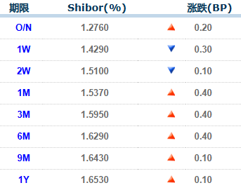 12月16日 ,上海银行间同业拆放利率(Shibor)涨跌互现。 隔夜shibor报1.2760%,上涨0.20个基点 ; 7天shibor报1.4290%,下跌0.30个基点; 1个月shibor报1.5370%,上涨0.40个基点; 3个月shibor报1.5950%,上涨0.40个基点;